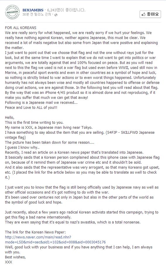 昨日、戦犯旗の会社が、フェイスブックに釈明文を掲載しました。