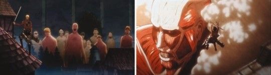 巨人はずっと進撃して来て、人間の領土を侵略するが、知的能力のない彼らは何の理由もなく盲目的に人間をとって食べてばかりいる存在として描かれる。