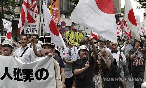 どこに向かうのか?(AP=連合ニュース)在特会など反韓民族主義性向の日本人が、昨年5月19日、在日同胞に「特権」が与えられていると非難して、日の丸を持って東京の街でデモを行っている様子。marshal@yna.co.kr