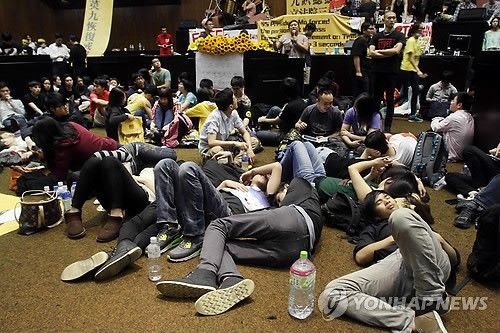 中国とのサービス貿易協定の締結に反対して、台北立法院(国会)本会議場を占拠している台湾の大学生が20日、床で眠っている。